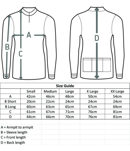 | Armpit to Armpit | 42 | 16.5 | 46 | 18 | 48 | 19 | 52 | 20.5 | 54 | 21.26 |
